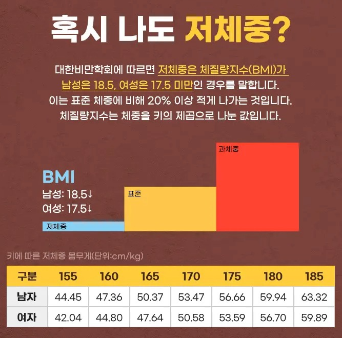 이미지에서처럼 자신의 키와 몸무게를 확인하고 저체중이라면 목표 체중을 잡아 식사량을 조절하는 것이 중요합니다. 근육의 양을 늘려주는 운동을 하는 것도 필요합니다.