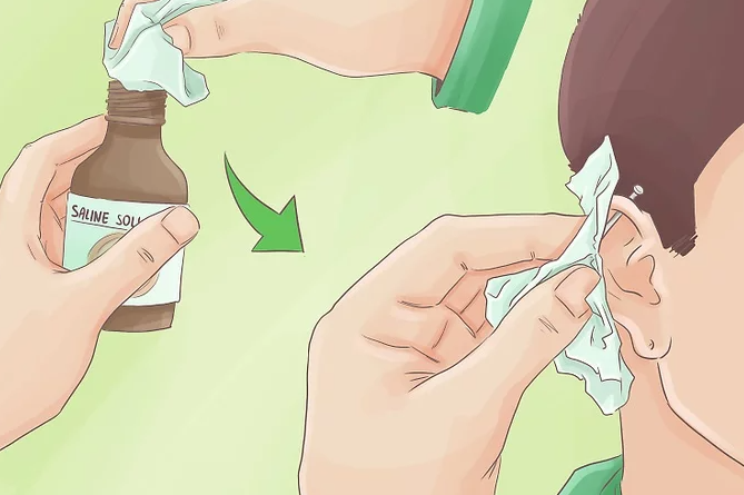 피어싱한 자리를 세척할 때는 거즈나 키친타월 등에 식염수를 적시고 피어싱 부위에 지그시 올려 5-10분정도 놓아줍니다. 하루에 한두번 이렇게 해주면 병균이 침투하지 못하도록 할 수 있습니다.